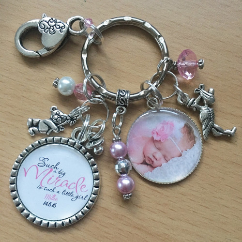 Beautiful Birth Date Keyring with text reading "Such a Big Miracle in Such a Little Girl". Beautiful keyring to carry with your babies photo and birthdate. You can have a name & date of birth on one tag, and a photo on the other. Colour of beads can also be changed at your request. Please leave a note on your order with the name & date you would like on your keyring, or if you would like different colour beads.