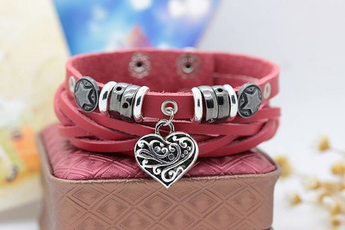 Exquisite Red leather wrap bracelet with silver heart drop charm. This high quality leather bracelet will compliment any outfit. Bracelet is adjustable fit with two closures