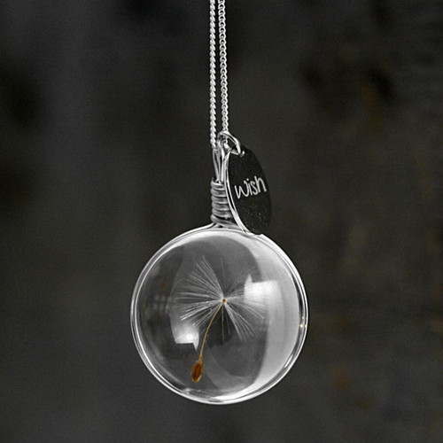 Make one Wish. Whimsical Dandelion Wish Necklace. This beautiful glass dome necklace contains one single delicate Dandelion seed, perfectly captured between two glass domes. Finished off with a Wish Charm tag.